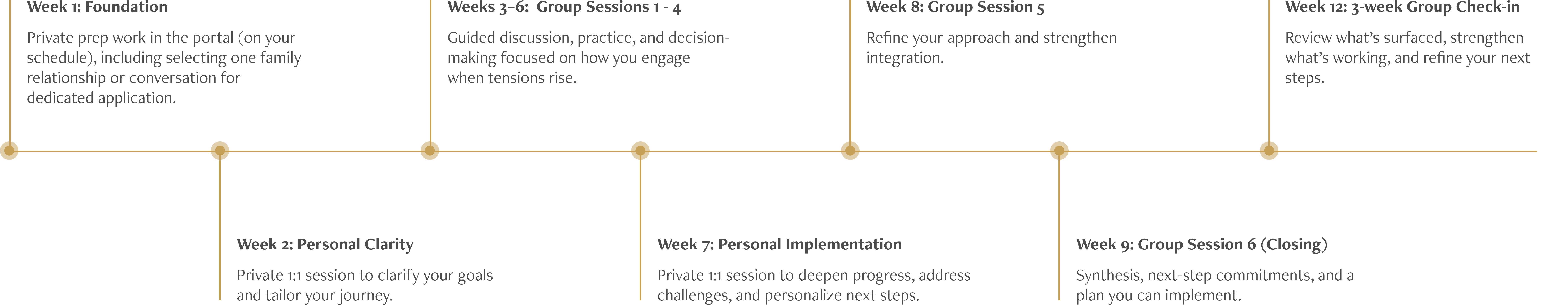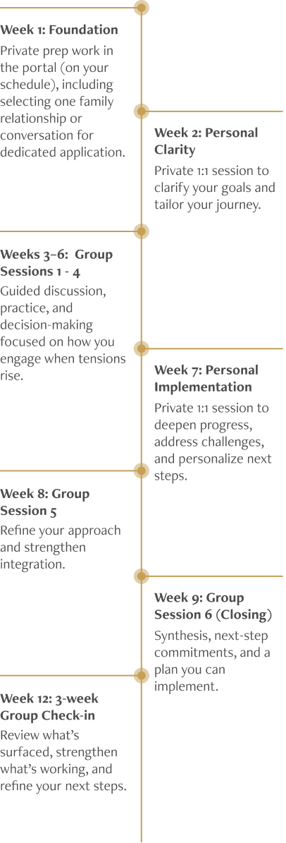 This experience takes place within a small, thoughtfully curated group of women doing similar work inside their own family system.